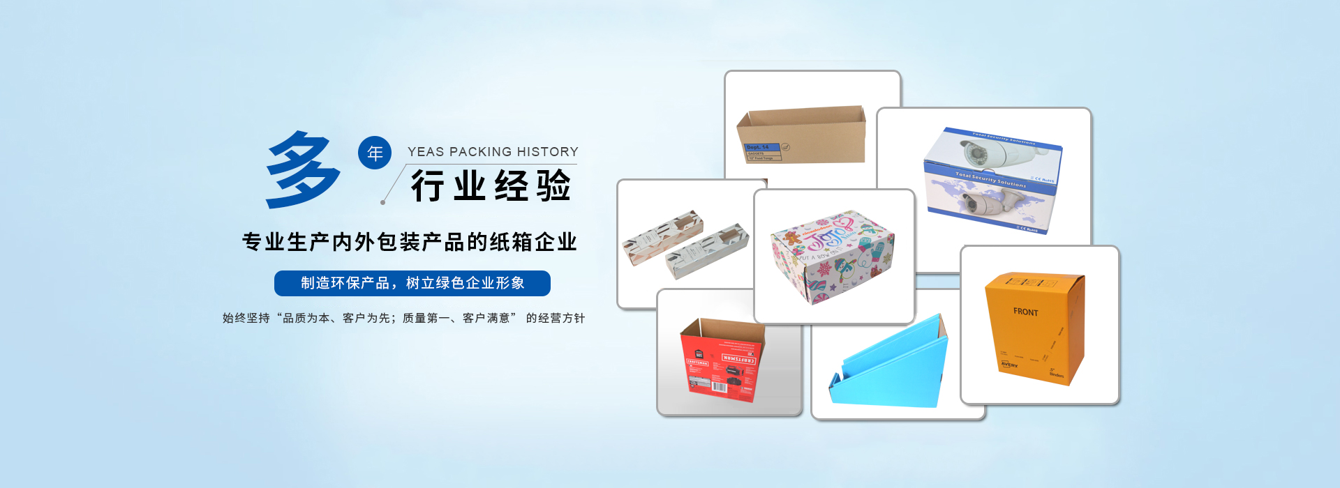 我司主要生產(chǎn)瓦楞紙箱、隔板,禮品盒、彩盒,啤盒;啤卡 ,紙護(hù)角 ,紙卡板,說明書,不干膠,珍珠棉,輔助包材集生產(chǎn)和銷售于一體;公司在材料采購(gòu)、生產(chǎn)控制、成品檢驗(yàn)、售后服務(wù)包裝需求嚴(yán)格執(zhí)行ISO9001質(zhì)量體系標(biāo)準(zhǔn);我公司目前為SONY,欣旺達(dá)電子,嘉盛照明,庫偉實(shí)業(yè),洲明節(jié)能科技; 泛美照明科技, 怡化金融設(shè)備,美利龍餐具,中天世紀(jì),東芝電器 ,共進(jìn)電子等大中型企業(yè)公司配套供應(yīng)包裝紙箱,建立了穩(wěn)定的合作關(guān)系。